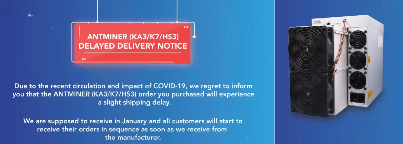 Due to the recent circulation and impact of COVID-19, we regret to inform you that the ANTMINER (KA3/K7/HS3) order you purchased will experience a slight shipping delay.