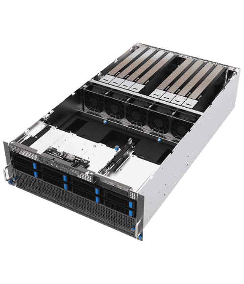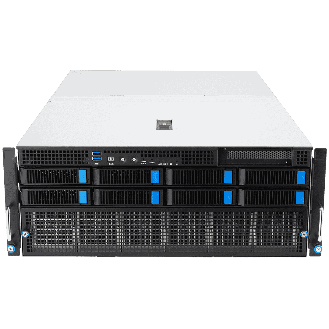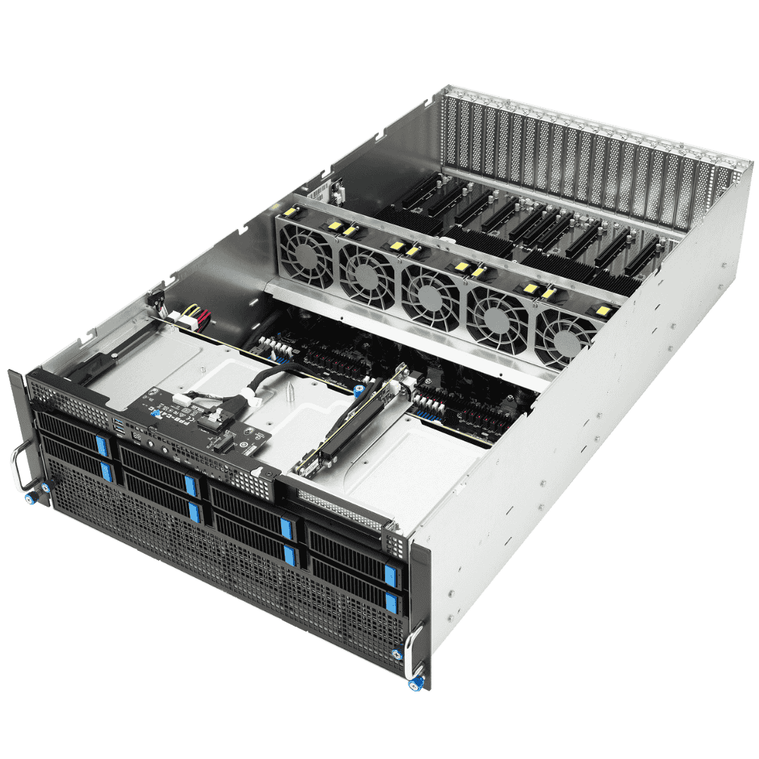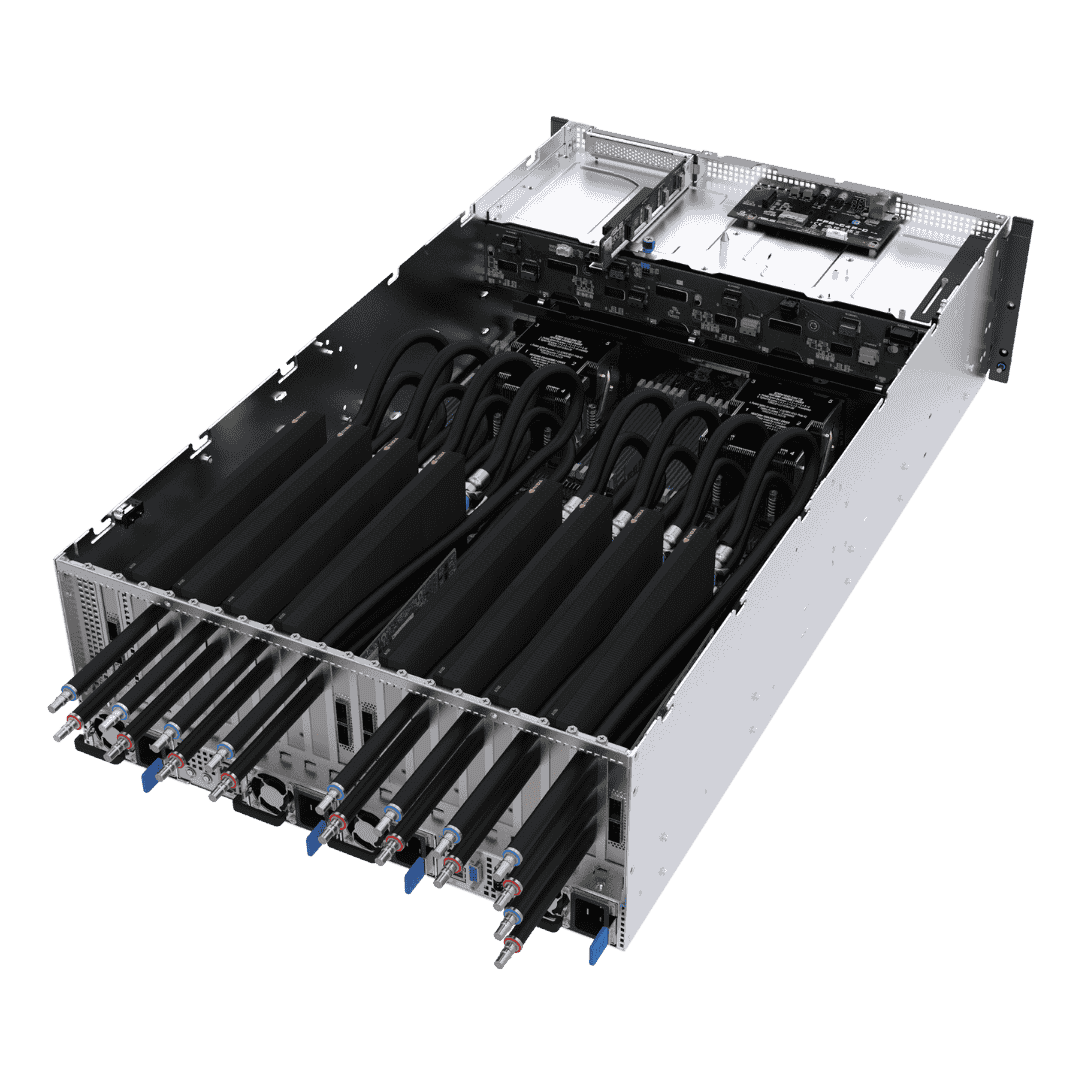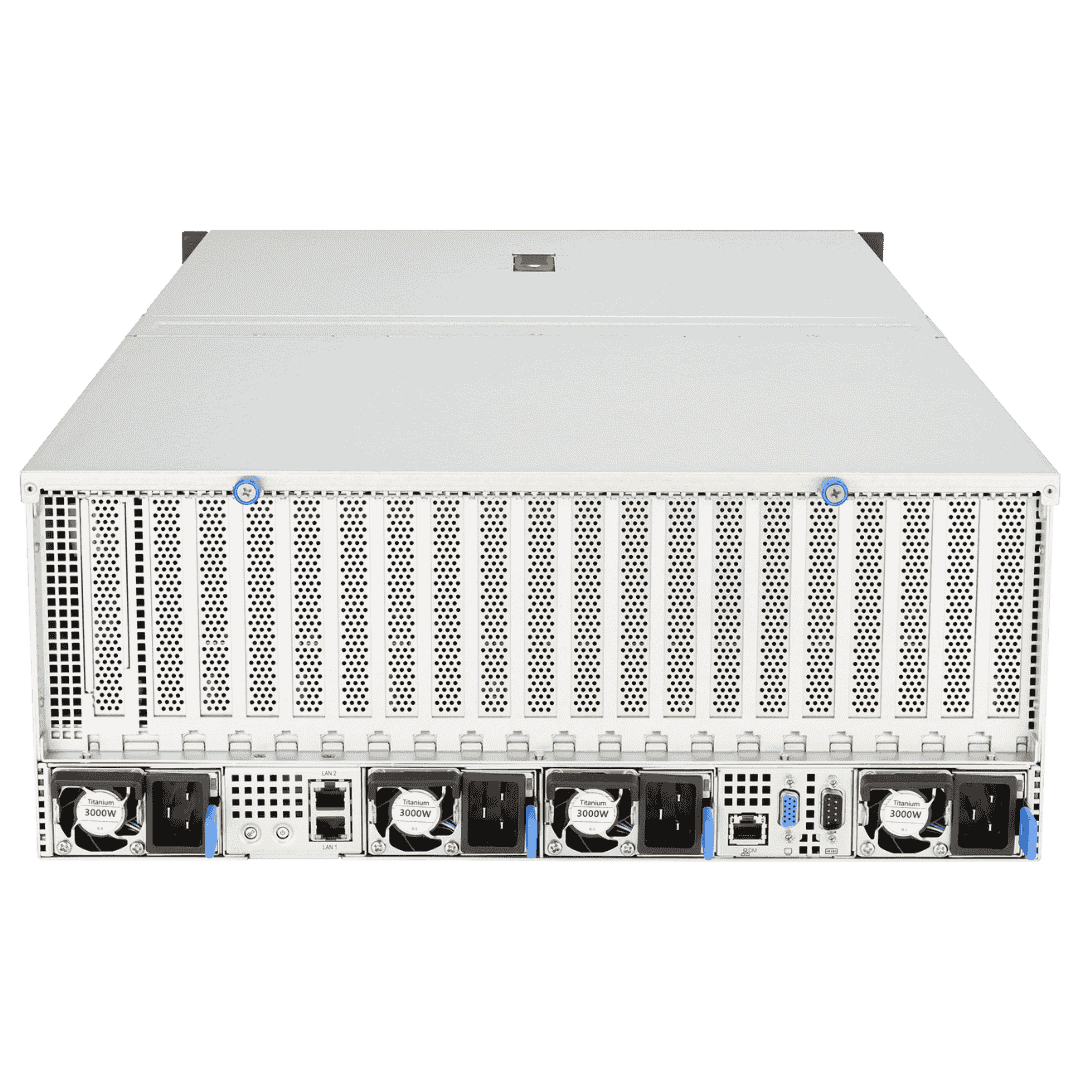 AMD EPYC™ 9004 dual-processor 4U GPU server that supports eight dual-slot GPUs, PCIe 5.0 Switch Solution, up to 24 DIMM, 13 PCIe 5.0 slots, eight NVMe, four 3000W Titanium power supplies, OCP 3.0 and ASMB11-iKVM