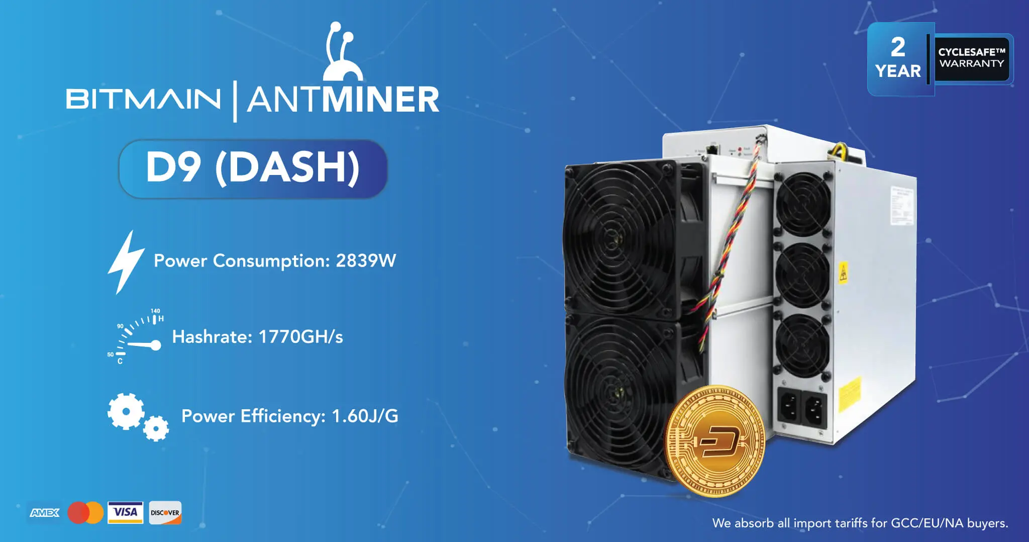 The D9, a powerhouse designed for Dash mining, offers a formidable hashrate of 1770 GH/s with a minimal variance of ±3%. Operating at 2839 Watts with fluctuations within ±10%, it balances power consumption and performance efficiently. With a power efficiency rating of 1.60 J/T, it ensures optimal energy usage. Its hardware configuration includes RJ45 Ethernet 10/100M networking connection mode and dimensions of 430195.5290 mm. Weighing 16.1 kg (net) and 17.7 kg (gross), it combines solidity with manageability. Operating temperature ranges from 0 to 40°C, storage temperature from -20 to 70°C, and operational humidity from 10 to 90%, ensuring adaptability to diverse environments. Additionally, it functions reliably at altitudes up to 2000m.