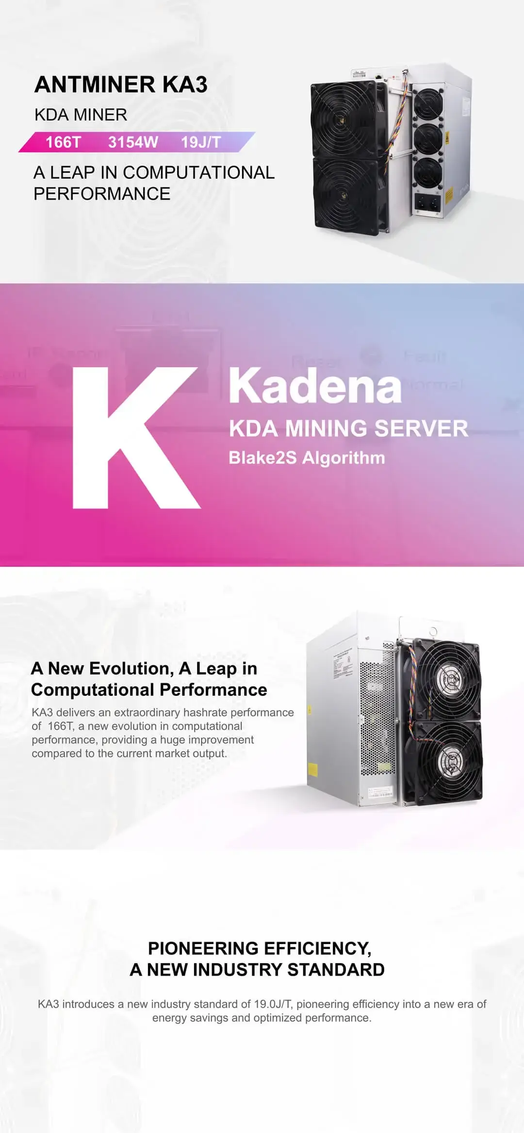 KA3 delivers an extraordinary hashrate performance of 166T, a new evolution in computational performance, providing a huge improvement compared to the current market output.
