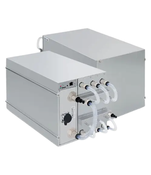 The T19 Pro Hyd. is a cutting-edge bitcoin miner designed for the SHA256 algorithm, supporting BTC, BCH, and BSV cryptocurrencies. It boasts a remarkable hashrate of 246 TH/s, operating with a power efficiency of 22 J/TH at a consumption of 5412 Watts at 35°C. The miner is engineered for optimal performance with a power supply voltage of 380~415V AC, accommodating an input frequency range of 50~60 Hz and an input current of 12 Amps. Its robust hardware configuration includes a compact design measuring 410x170x209 mm without packaging and 570x316x430 mm with packaging, weighing 12.8 kg net and 14.1 kg gross. The T19 Pro Hyd. utilizes deionized or pure water as its working fluid, highlighting its advanced cooling and efficiency features for sustainable and profitable mining operations.