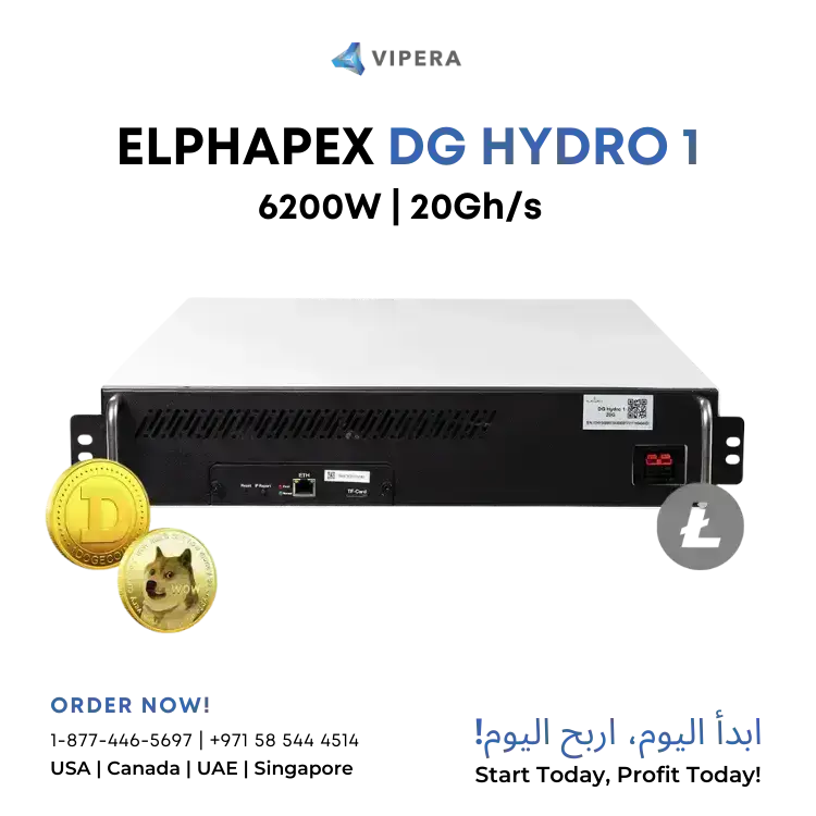 ElphaPex DG Hydro 1 is an ASIC miner designed for Scrypt algorithm, specifically targeting DOGE (Dogecoin) and LTC (Litecoin). It delivers a maximum hashrate of 20Gh/s while consuming 6200W of power, resulting in an energy efficiency of 0.31j/Mh.