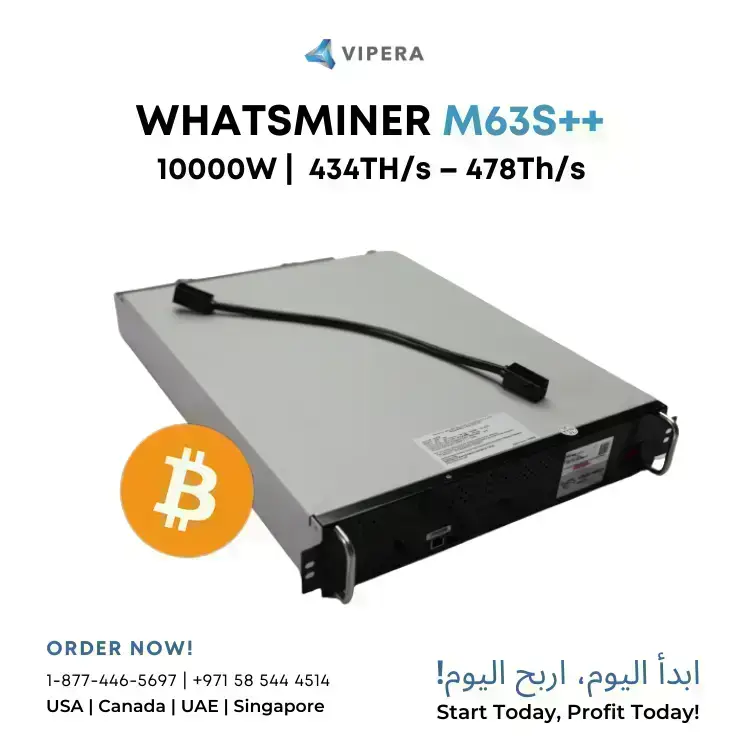Microbt produces WhatsMiner M63S++ and runs using the SHA-256 algorithm, specifically targeting BTC (Bitcoin) mining. with a maximum hash rate of 478Th/s and power consumption of 10000W, resulting in an energy efficiency of 20.921j/Th.