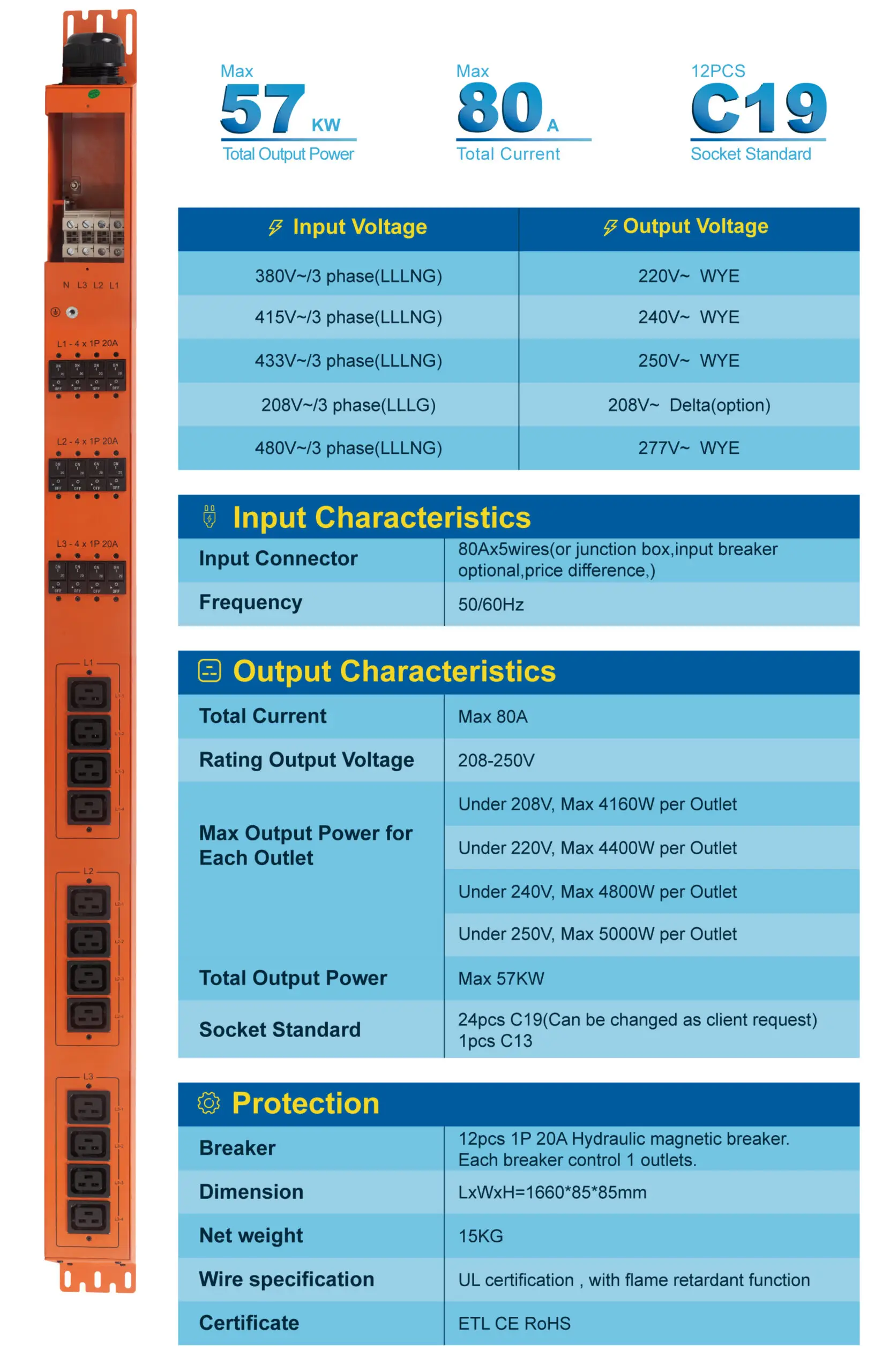 | 433V-/3 phase(LLLNG) | 250V~ WYE | Max Output Power for Each Outlet: Under 208V, Max 4160W; Under 220V, Max 4400W; Under 240V, Max 4800W; Under 250V, Max 5000W |